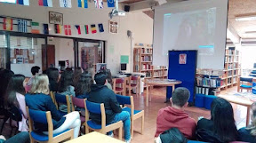 Eu na minha alegre casinha em Bruxelas e eles na biblioteca escolar da EBS do Agrupamento de Escolas de Miranda do Douro.